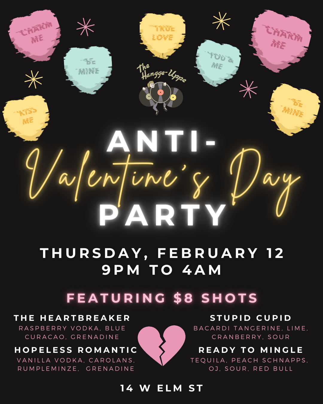 Forget the flowers, ditch the chocolates, and say goodbye to sappy love songs— The Hangge-Uppe is throwing the ultimate Anti-Valentine’s Day Party on Thursday, February 12 from 9pm to 4am. Revel in the single life and indulge in $8 shots featuring The Heartbreaker, Stupid Cupid, Hopeless Romantic, and Ready to Mingle. Feel like shedding some emotional baggage? Bring a photo of your ex or write their name down on a piece of paper to shred onsite and watch it disappear for good in our photo shredder station.